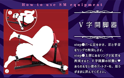 上部にあるリングで足首を拘束すると、V字開期の状態に♥